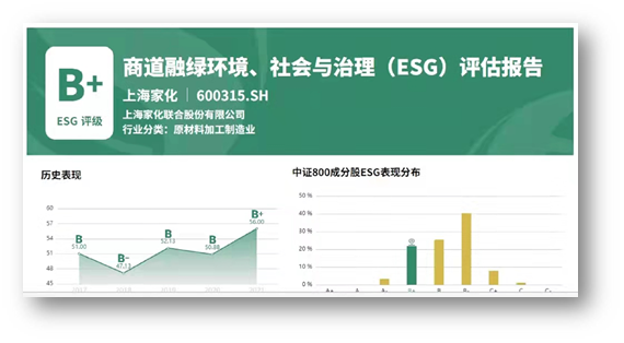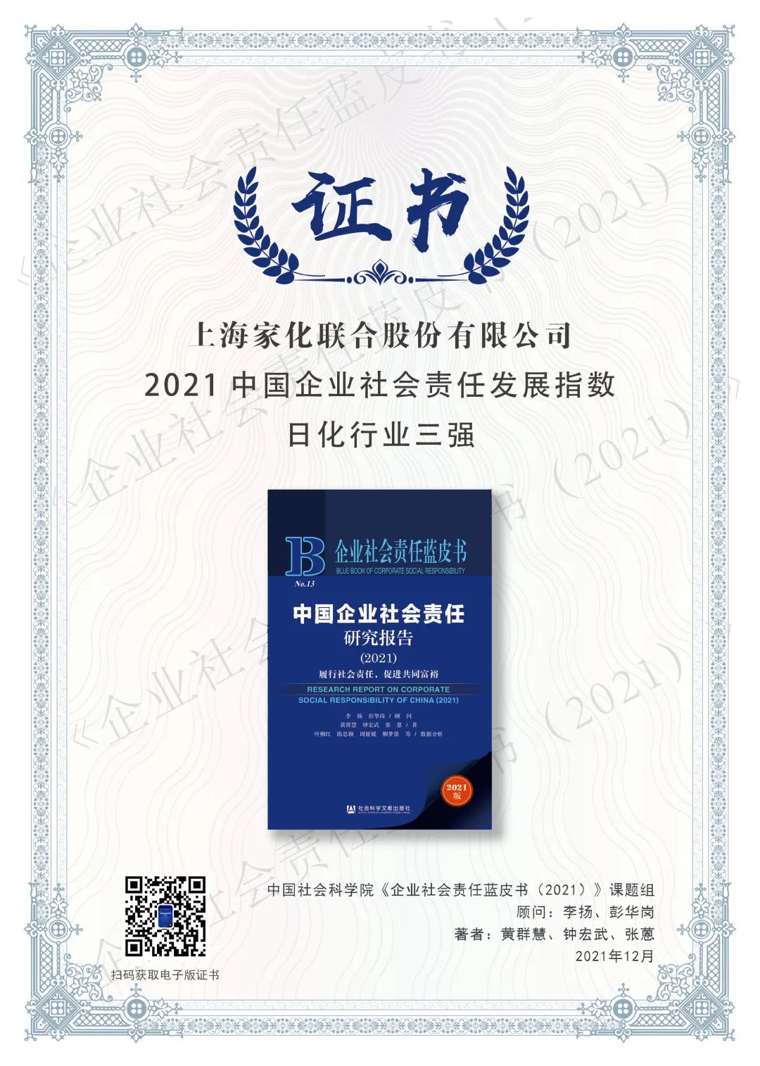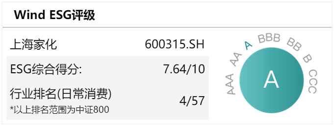 2021年,在上海家化上市20周年之际,公司还引入了国际领先的ESG责任管理理念,年度内获得知名金融数据机构Wind ESG评级A级,位列日常消费行业第四名;同时,公司还在国内领先ESG评级机构商道融绿的评级中,由上年度的B级提升至B+级。此外,上海家化还在由中国社科院编纂的《企业社会责任蓝皮书2021》中位列日化行业前三强,并在本土企业中位居第一。
