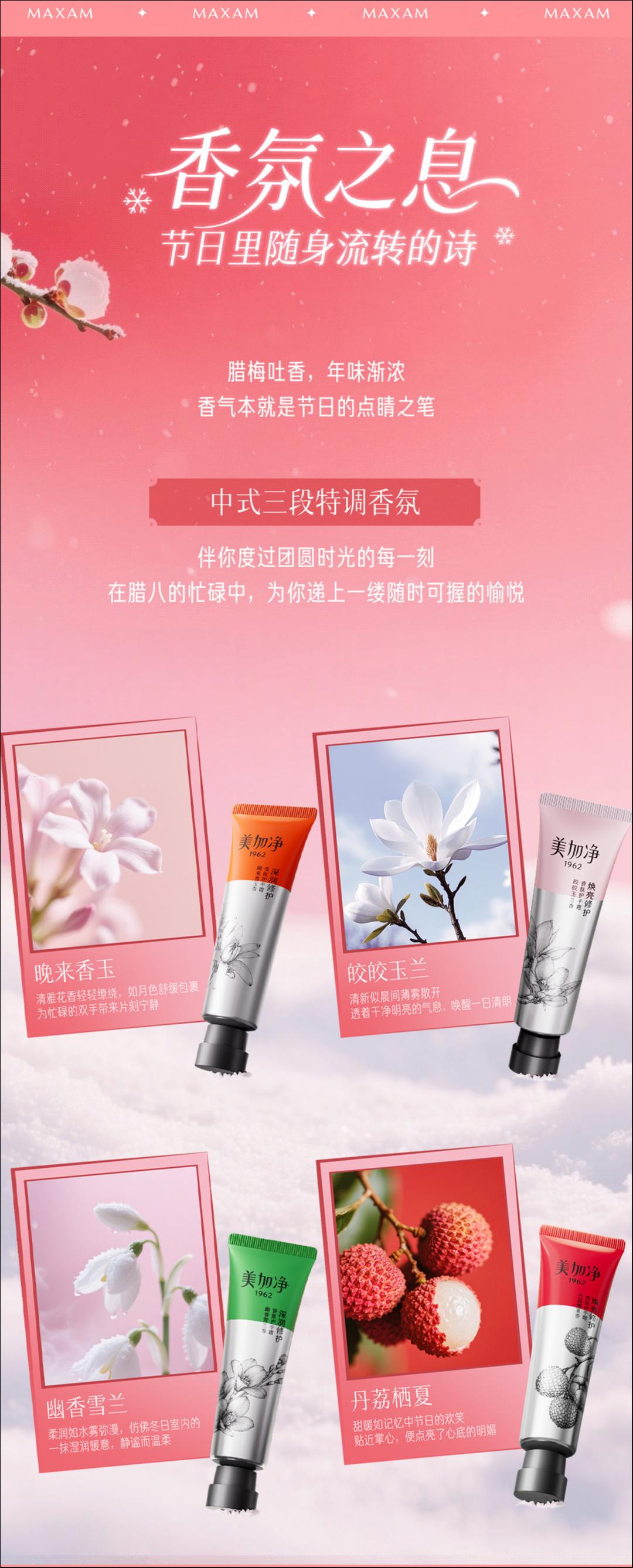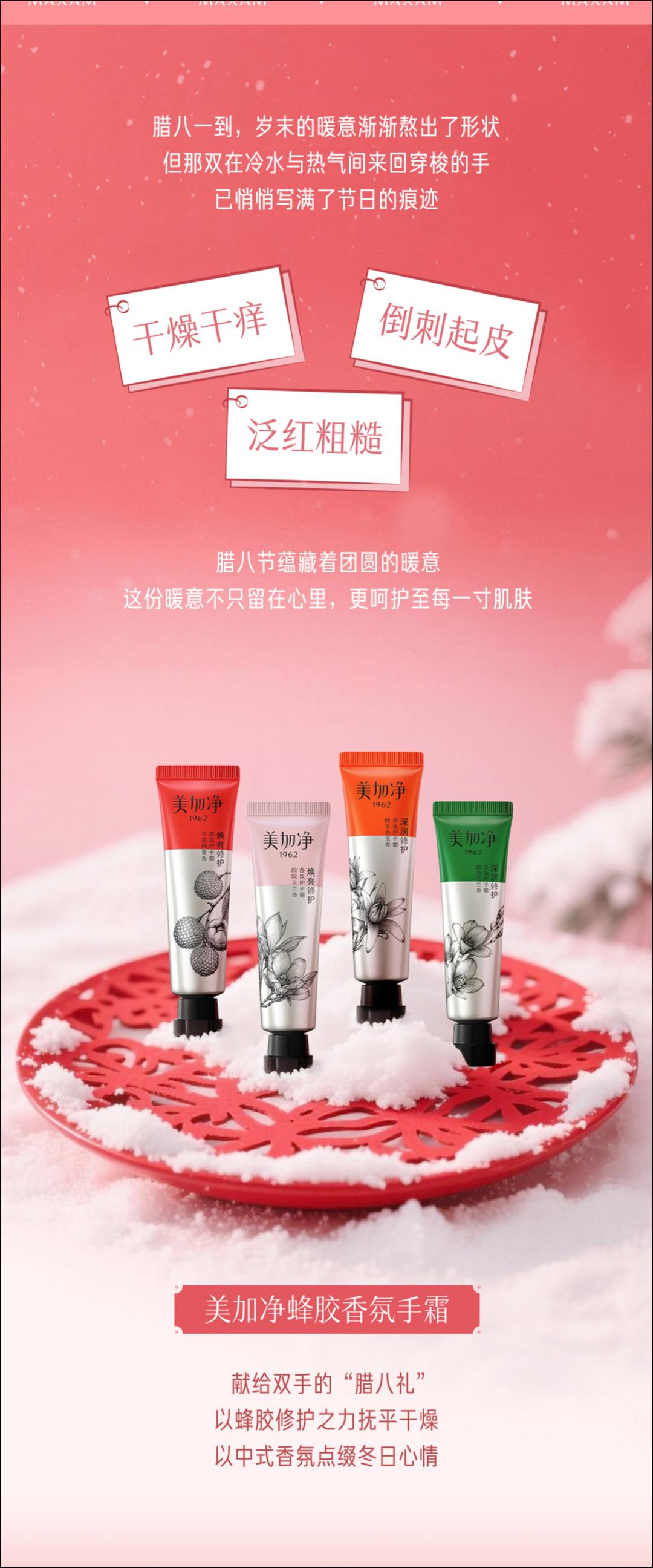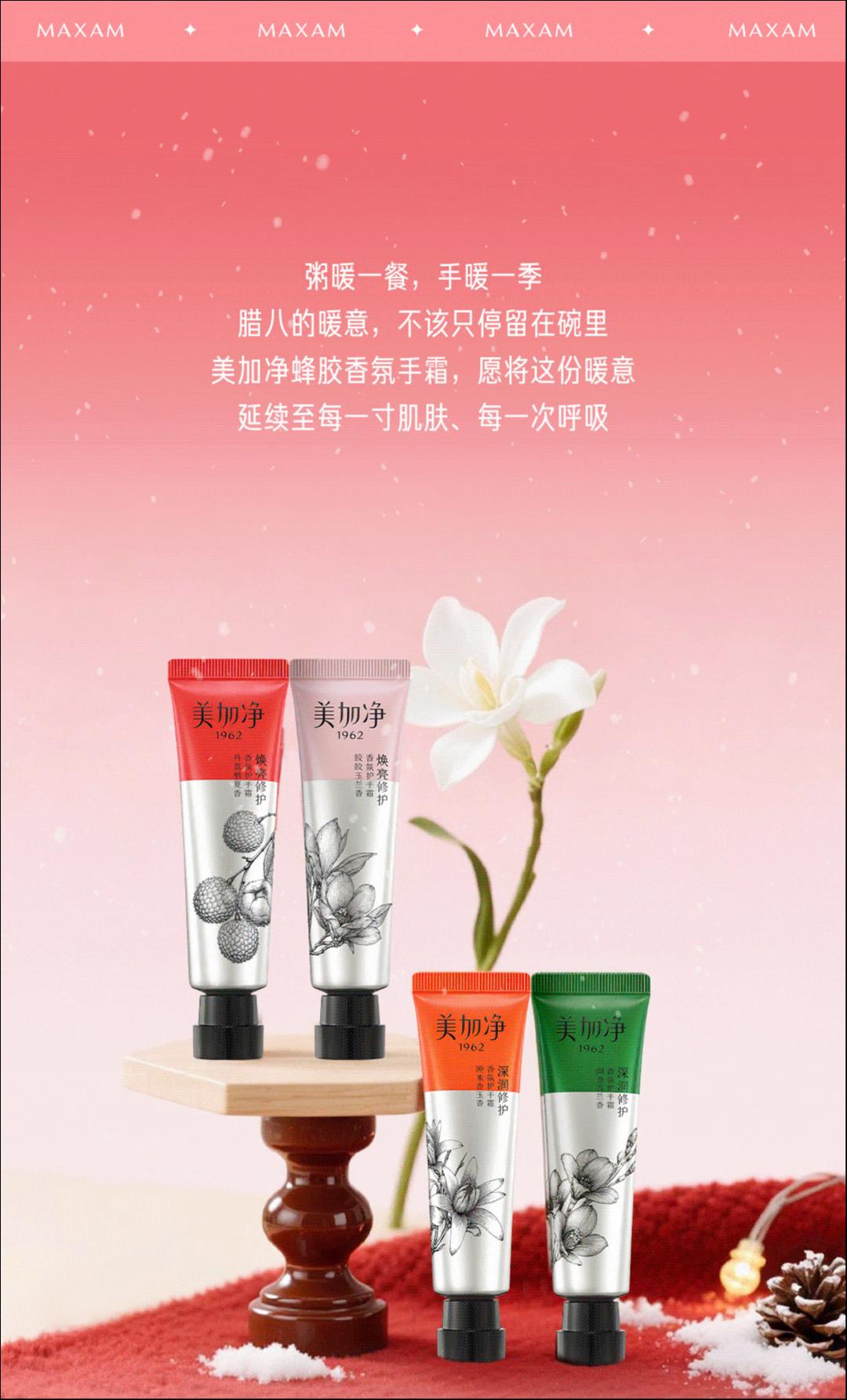 美加净蜂胶香氛手霜 —— 献给双手的“腊八礼”:以蜂胶修护之力抚平干燥,以中式香氛点缀冬日心情。