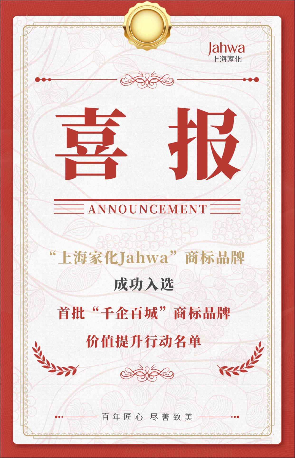 喜报!“上海家化Jahwa”商标品牌入选国家首批“千企百城”商标品牌价值提升行动名单