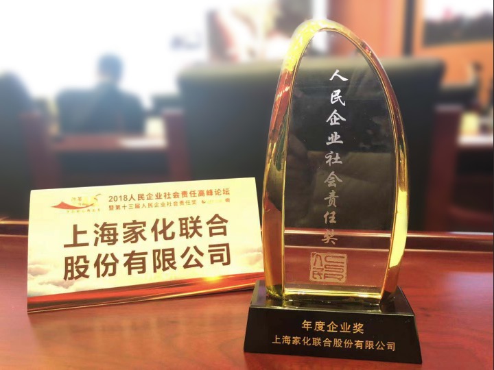 2018-12-18 12月17日,由人民网主办的“2018人民企业社会责任高峰论坛暨第十三届人民企业社会责任奖颁奖典礼”在北京举行,上海家化凭借在包括关爱消费者、携手合作伙伴、珍视员工、回报投资者、关注环境、支持政府、回馈社会等多位一体的企业社会责任体系中的优秀表现,荣膺“年度企业奖”,成为本届颁奖典礼中不二获此殊荣的日化企业。