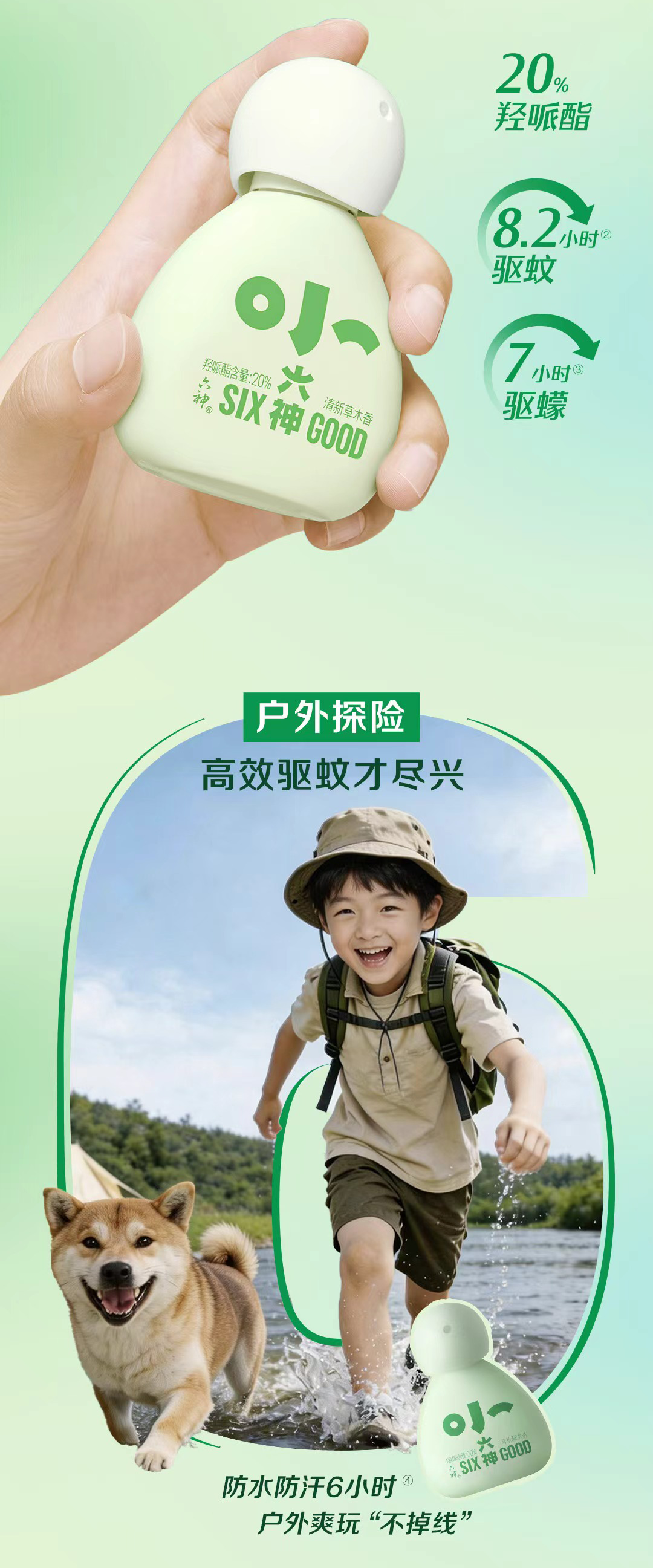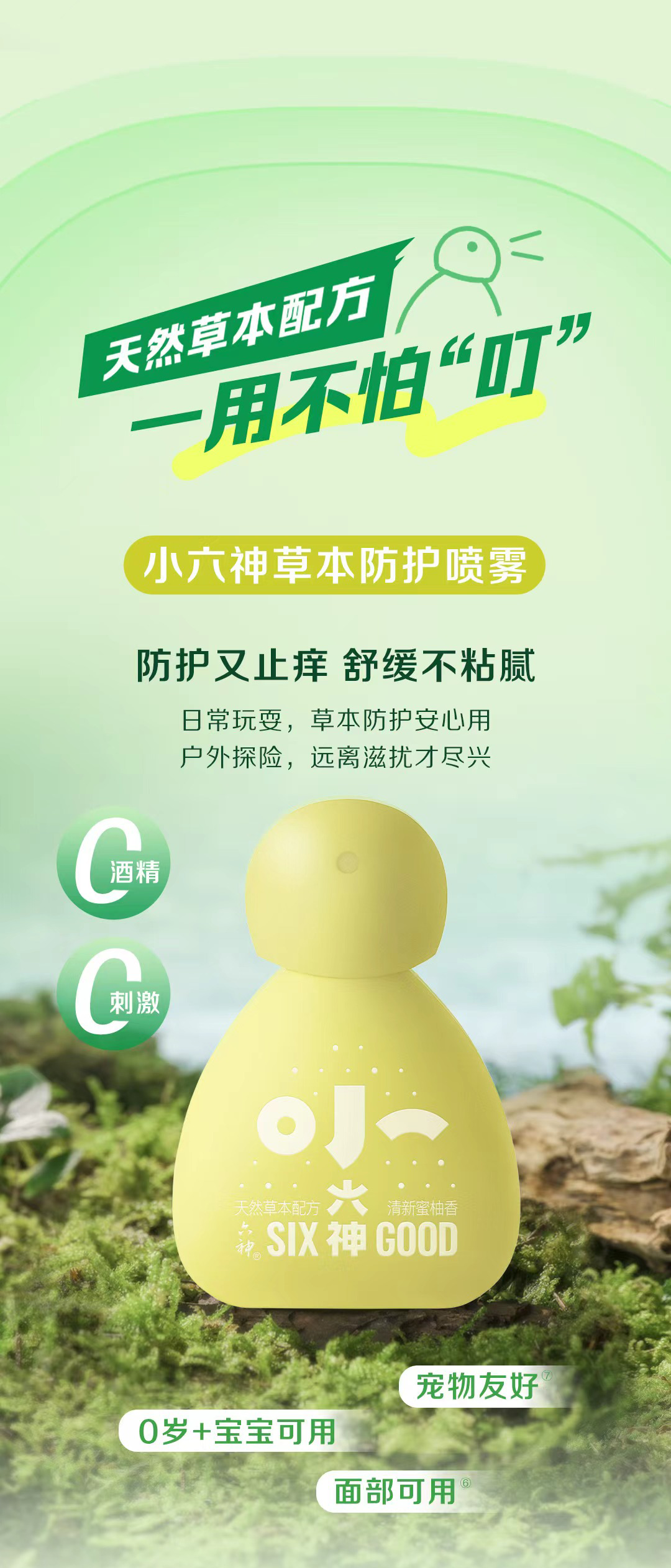 全新“小六神驱蚊花露水系列”及“小六神草本防护喷雾”采用天然草本配方,一用不怕“叮”,具备 A级防蚊力,户外长效“无蚊忧”。