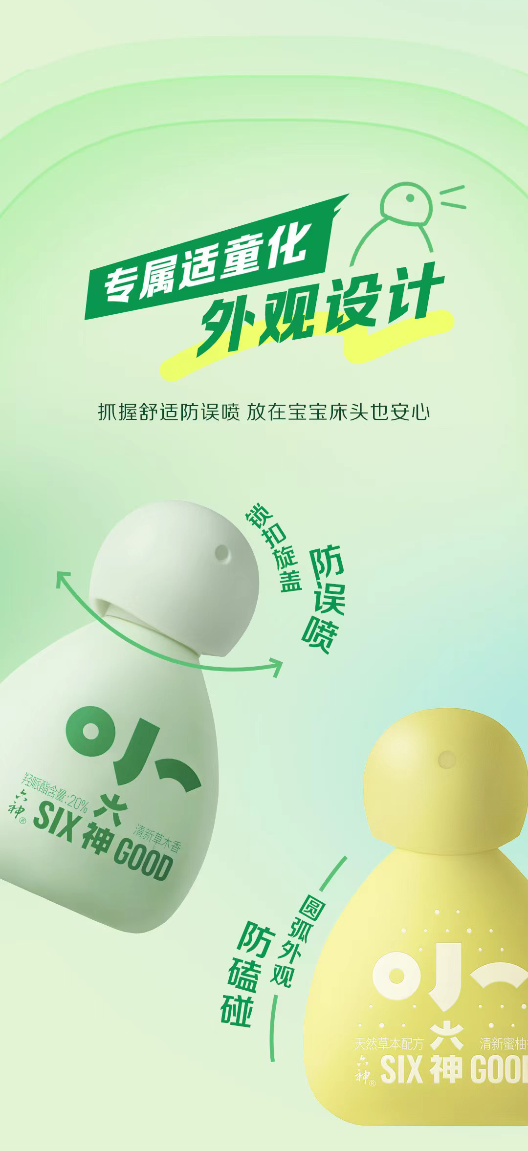 产品包装采用专属适童化外观设计,抓握舒适防误喷,放在宝宝床头也安心: