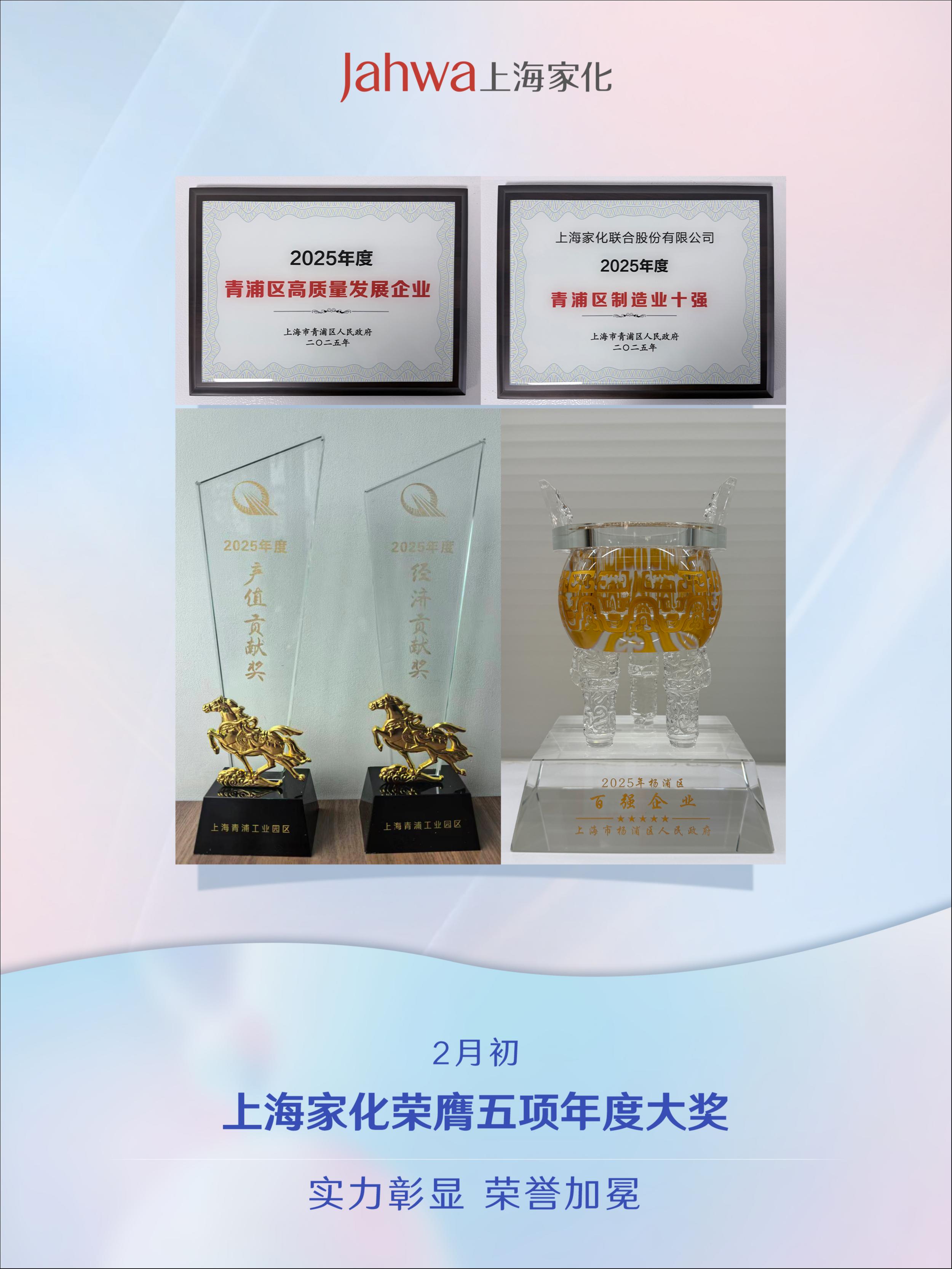 ✨2月初,上海家化在4号的青浦区团拜会、7号的青浦工业园区团拜会和10号的杨浦区团拜会中,分别获得“2025年度青浦区高质量发展企业”、“2025年度青浦区制造业十强”、“2025年度青浦工业园区产值贡献奖”、“2025年度青浦工业园区经济贡献奖”、“2025年杨浦区百强企业”重磅奖项,彰显了在产业高质量发展上的突出成果与硬核实力。