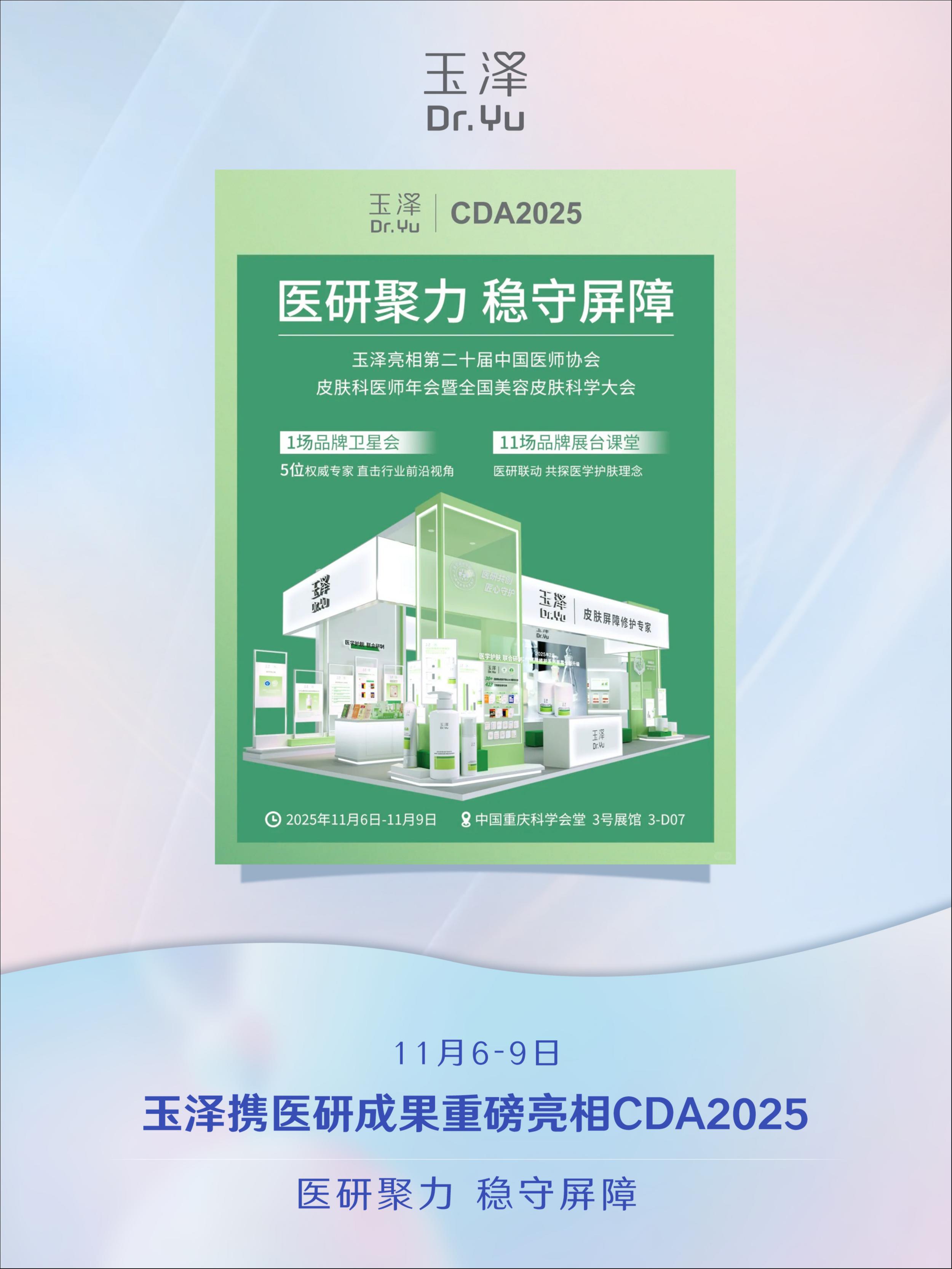 ✨1月6日至9日,第二十届中国医师协会皮肤科医师年会暨全国美容皮肤科学大会(CDA2025)在重庆隆重召开皮肤屏障修护专家玉泽再次受邀参会以专研实力重磅亮相,成为大会的焦点之一。