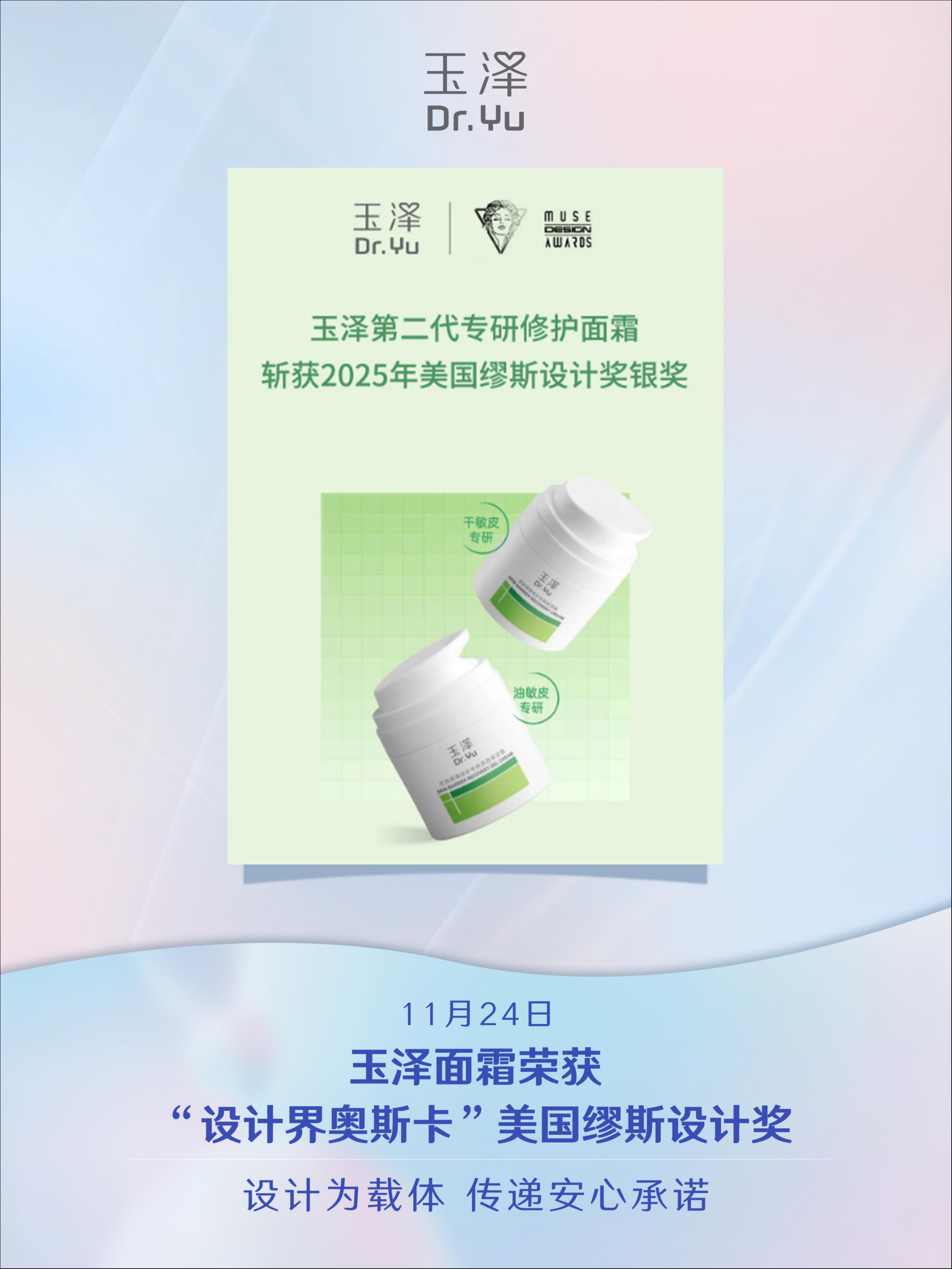 ✨11月24日,玉泽第二代专研修护面霜斩获2025年美国缪斯设计奖银奖。
