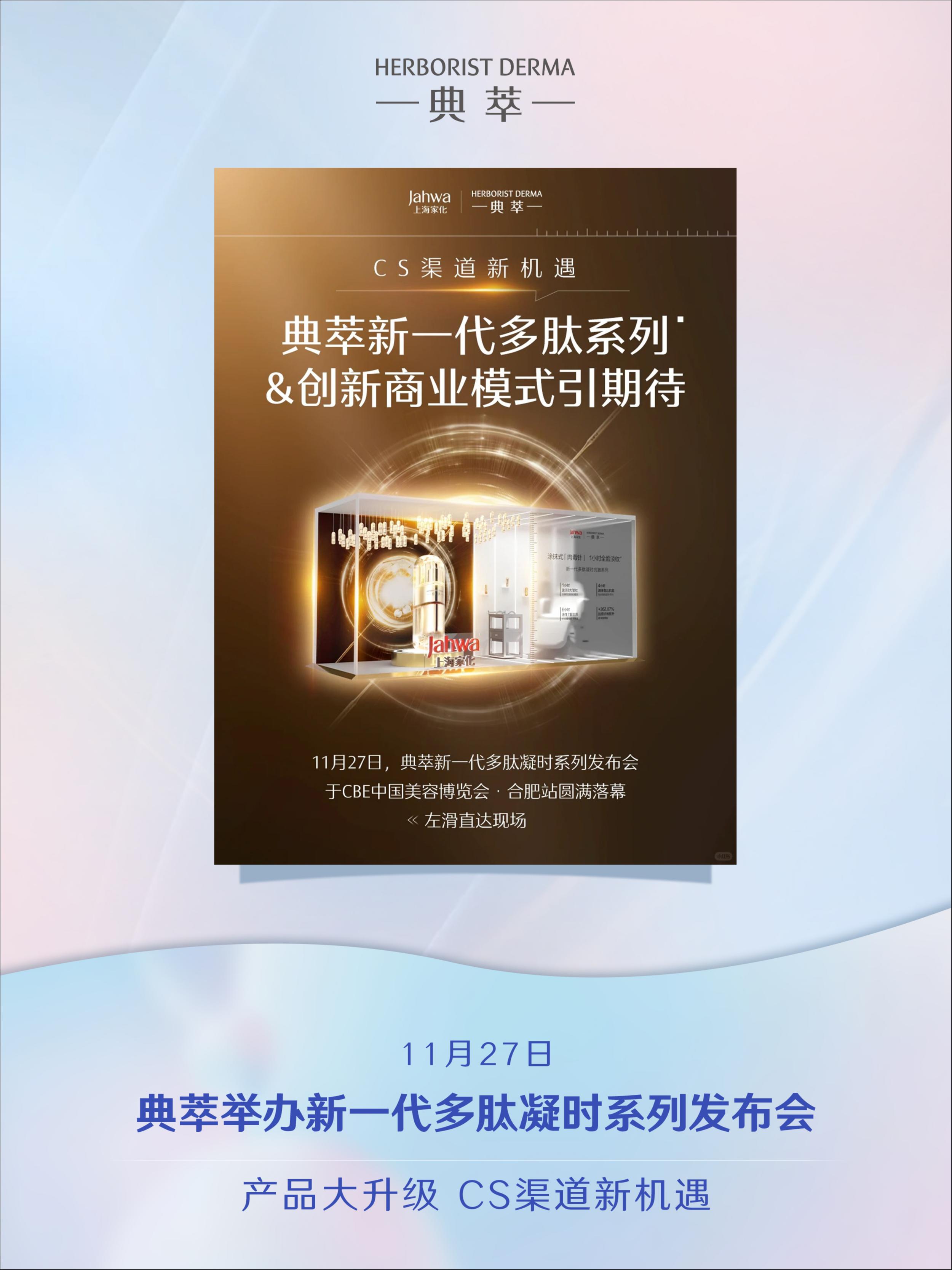 ✨11月27日,典萃新一代多肽凝时系列发布会于CBE中国美容博览会·合肥站隆重举办。作为“上海家化唯一的功效护肤品牌”以及上海家化重振CS渠道的最强承接者,典萃不仅首发行业领先级新品,还隆重官宣了CS渠道的新突破!