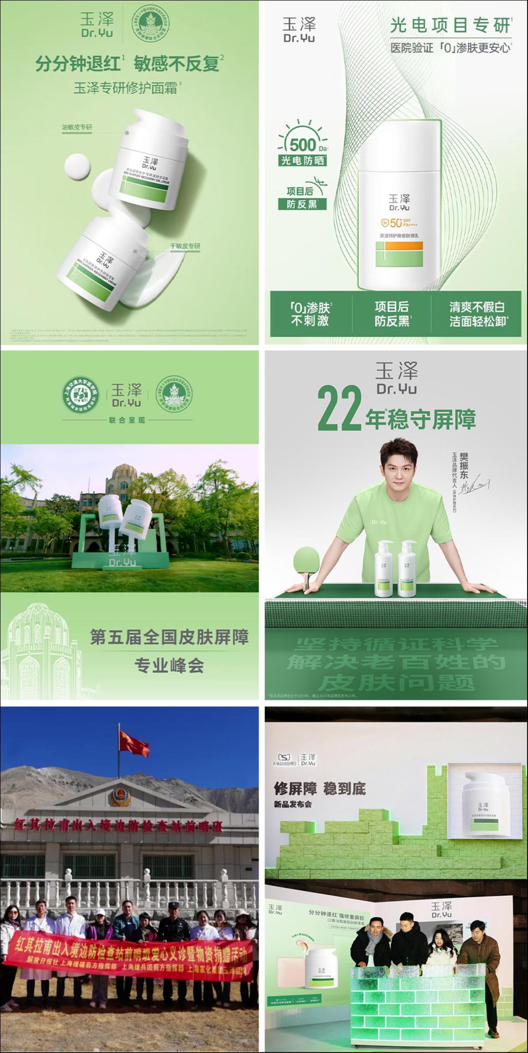 玉泽坚定“皮肤屏障修护专家”定位,持续深化医研共创。第二代青蒿修护面霜多年来首次全面升级,创新添加与中国中医科学院中药研究所联合研究的青蒿提取物,搭载上海交大附属瑞金医院皮肤科联合研制多年的 PBS屏障自生技术,焕新上市后实现两位数增长,其中干敏霜成为独立亿元单品。油敏霜、特润霜、500光电防晒等潜力单品紧随其后,夯实品牌矩阵。2025年玉泽不仅主办第五届全国皮肤屏障专业峰会并发表17篇权威期刊学术论文,还邀请了乒乓球世界冠军樊振东成为代言人,专业形象与品牌知名度同步提升。去年9月,以维稳修敏著称的玉泽前往世界海拔最高的国门——红其拉甫,为守护国门的边防战士义诊并捐赠皮肤护理产品;今年1月,玉泽在金山岭长城脚下与医学专家、长城专家进行了一场关于屏障守护的对话,屏障修护专家的医学护肤心智持续提升。