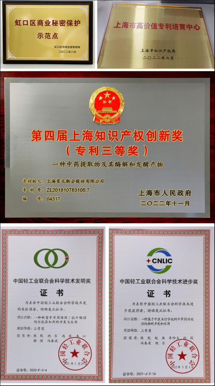 2021年,上海家化荣获由上海市人民政府和WIPO(知识产权组织)共同颁发的第三届上海市知识产权创新奖(保护奖)。2022年-2023年,上海家化先后被虹口区市场监督管理局和上海市市场监督管理局评为市区两级商业秘密保护示范点。累计目前,上海家化已获得上海专利示范企业、国家商标战略实施示范企业、上海市高价值专利培育中心等多项荣誉。旗下6件商标曾被评为上海市著名商标,3件商标被认定为国家驰名商标,拥有1500余件国内外注册商标以及600多件版权登记。
