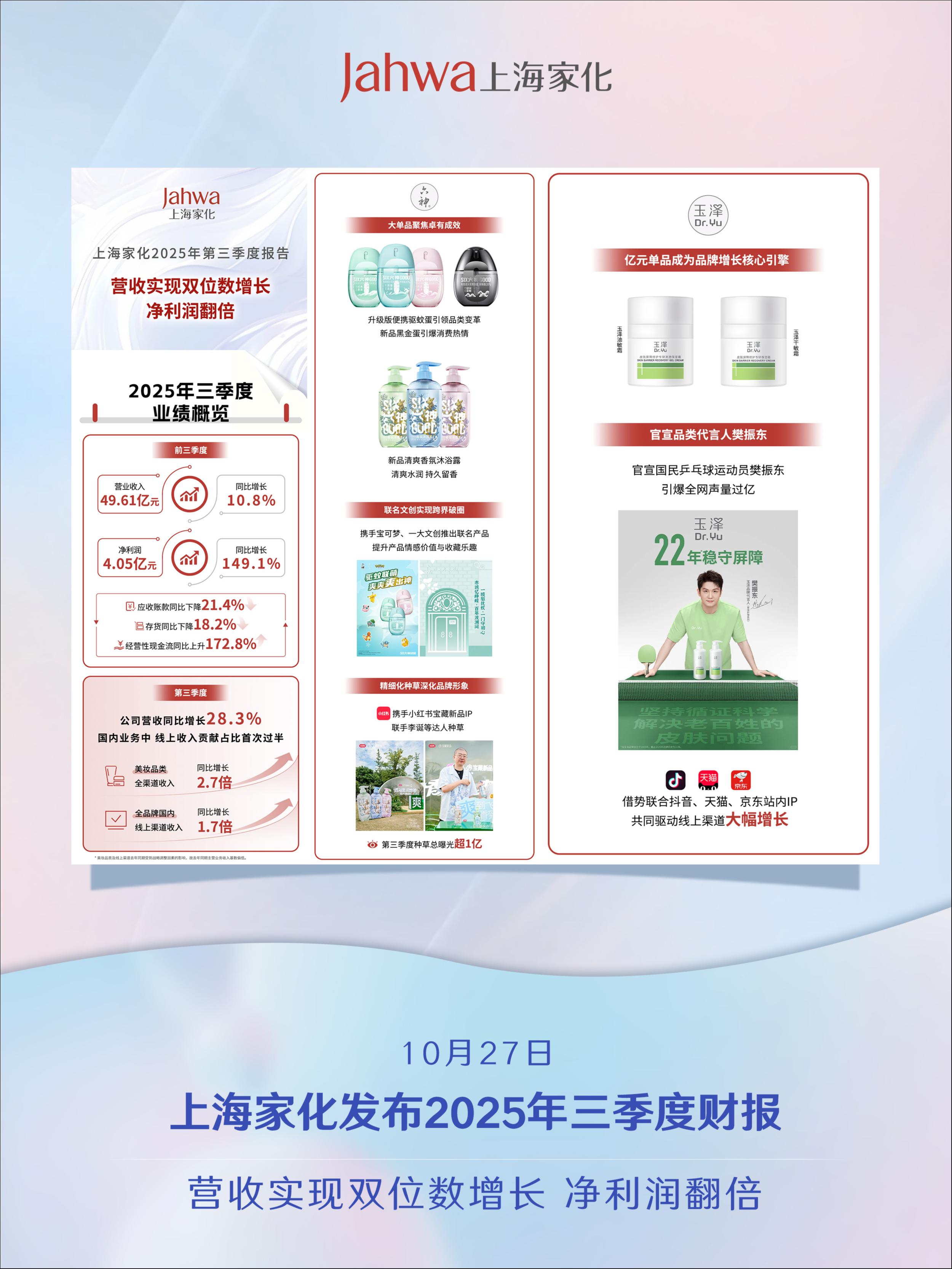 ✨10月27日晚,上海家化发布2025年第三季度业绩报告。报告显示,前三季度公司营业收入49.61亿元,同比增长10.8%;净利润4.05亿元,同比增长149.1%;扣非净利润2.31亿元,同比增长92.4%。其中第三季度表现尤其亮眼,Q3收入同比增长28.3%,分品类看,美妆业务全渠道收入同比增长2.7倍;分渠道看,国内业务线上渠道收入同比增长1.7倍,国内业务中,线上收入贡献占比首次过半。
