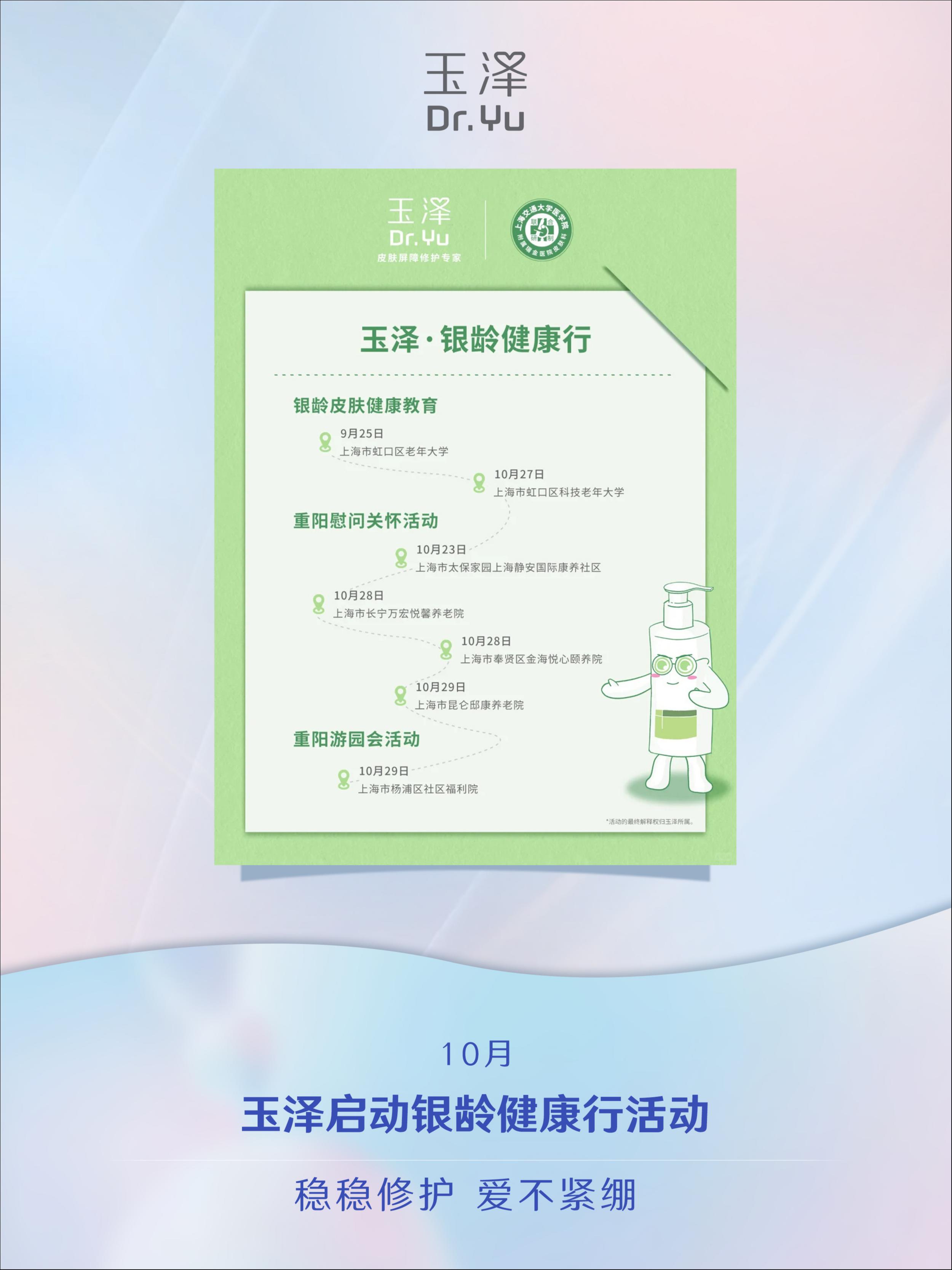 ✨十月,玉泽聚焦银龄皮肤护理需求,暖心启动“银龄健康行”公益活动。通过开展皮肤健康科普讲堂、走访慰问养老机构等系列行动,助力银龄群体建立科学护肤理念,以专业医学护肤产品守护银龄皮肤健康。