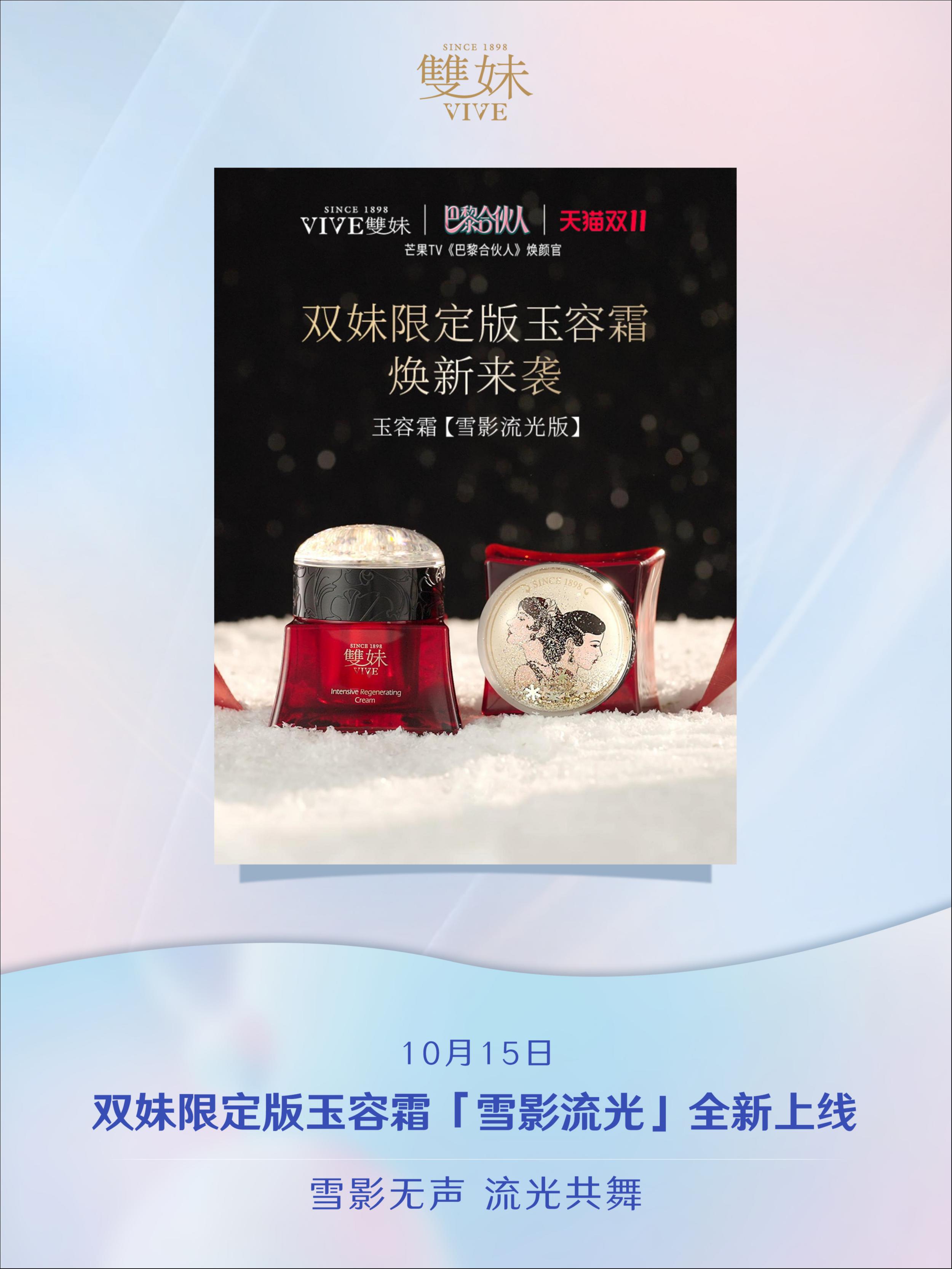 ✨10月15日,双妹限定版玉容霜(雪影流光版)全新上线,将舞会风姿,凝驻成雪夜的浪漫,衣袂掠起的流光,坠入鎏金瓶盖。