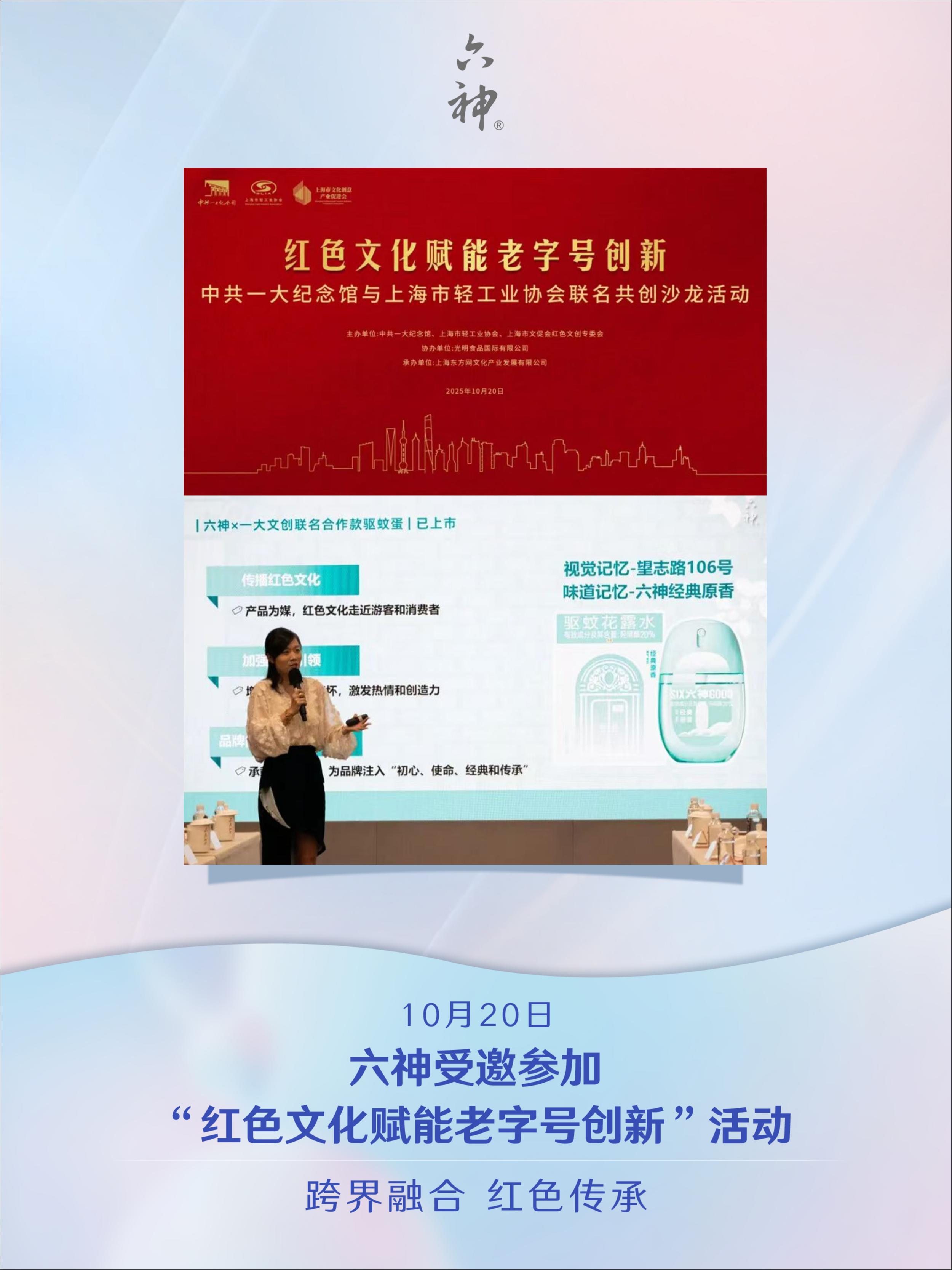 ✨10月20日,六神受邀参加中共一大纪念馆“红色文化赋能老字号创新”,分享六神与一大文创联名产品。