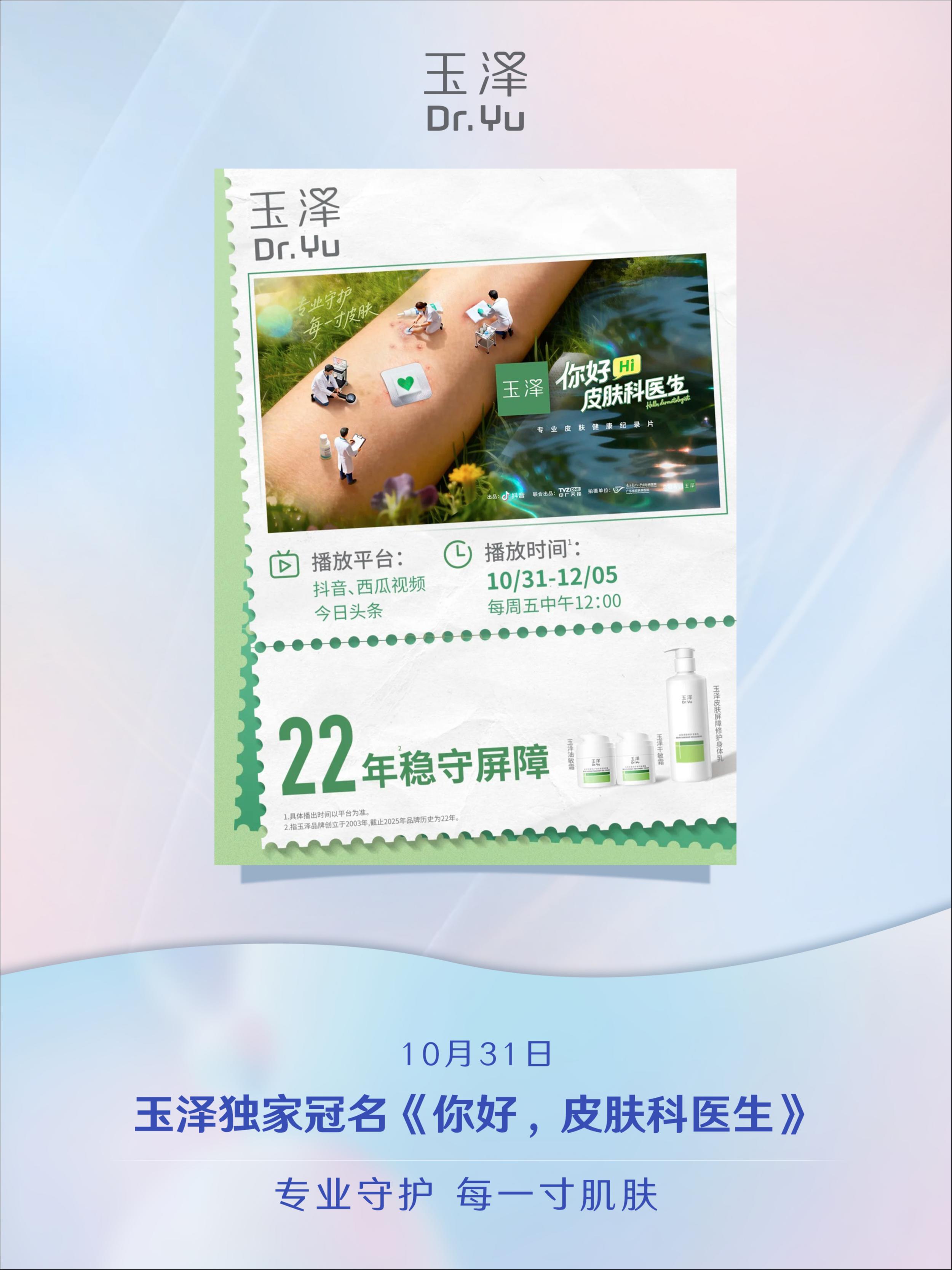 ✨10月31日,玉泽独家冠名的专业皮肤健康纪录片「你好,皮肤科医生」正式上线。与玉泽一起走进皮肤科医生的工作日常,见证仁心与专业!