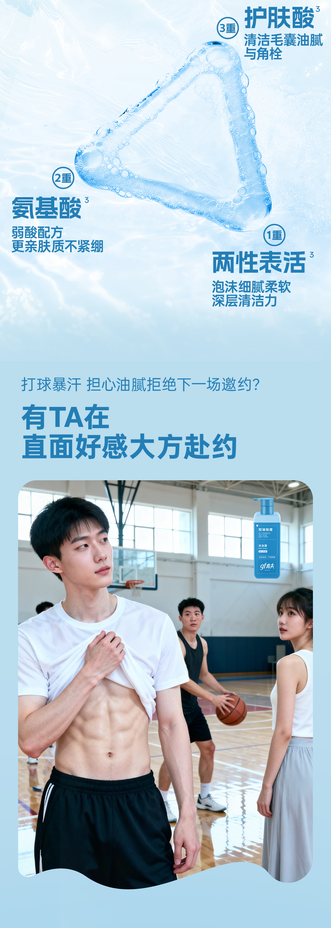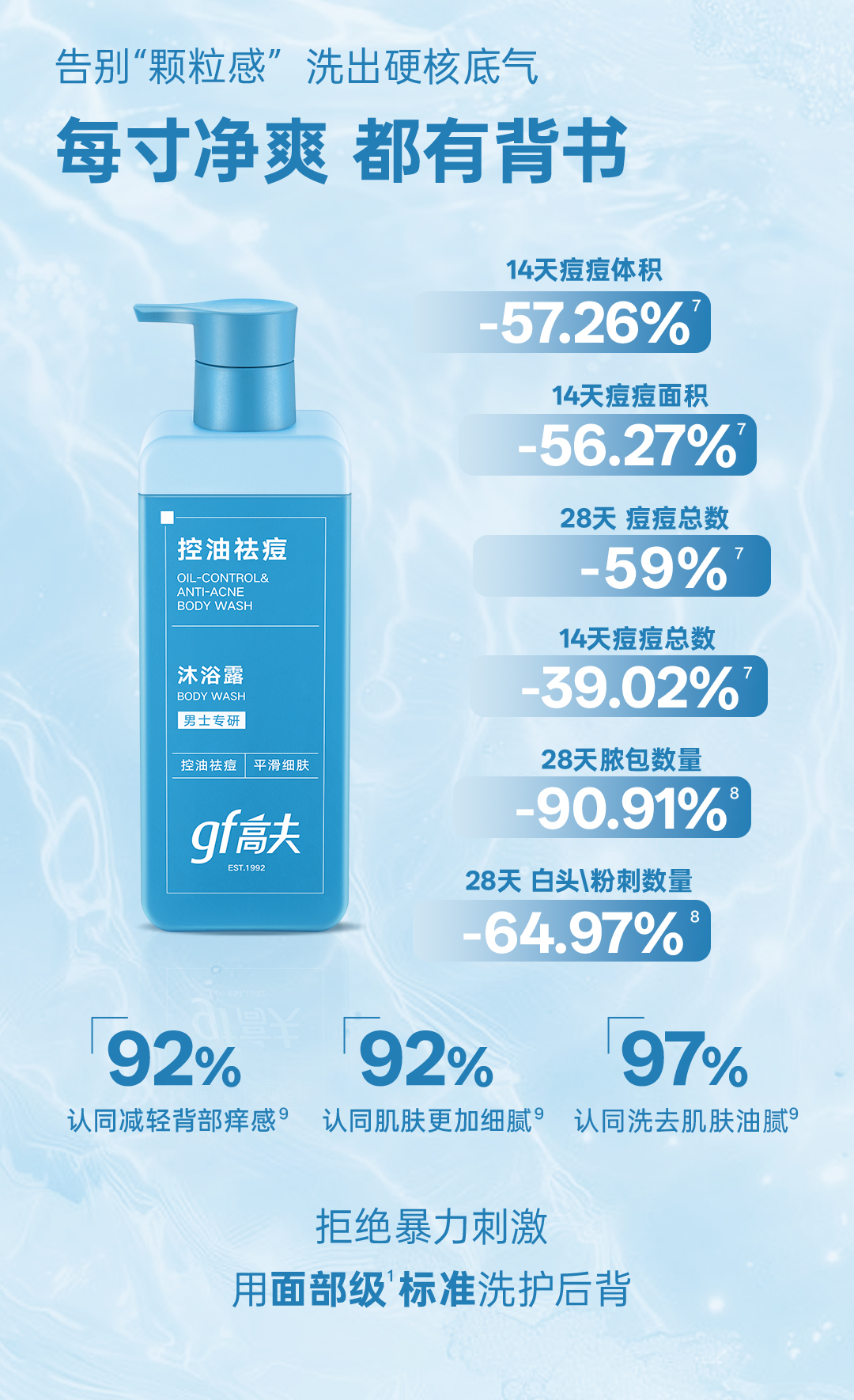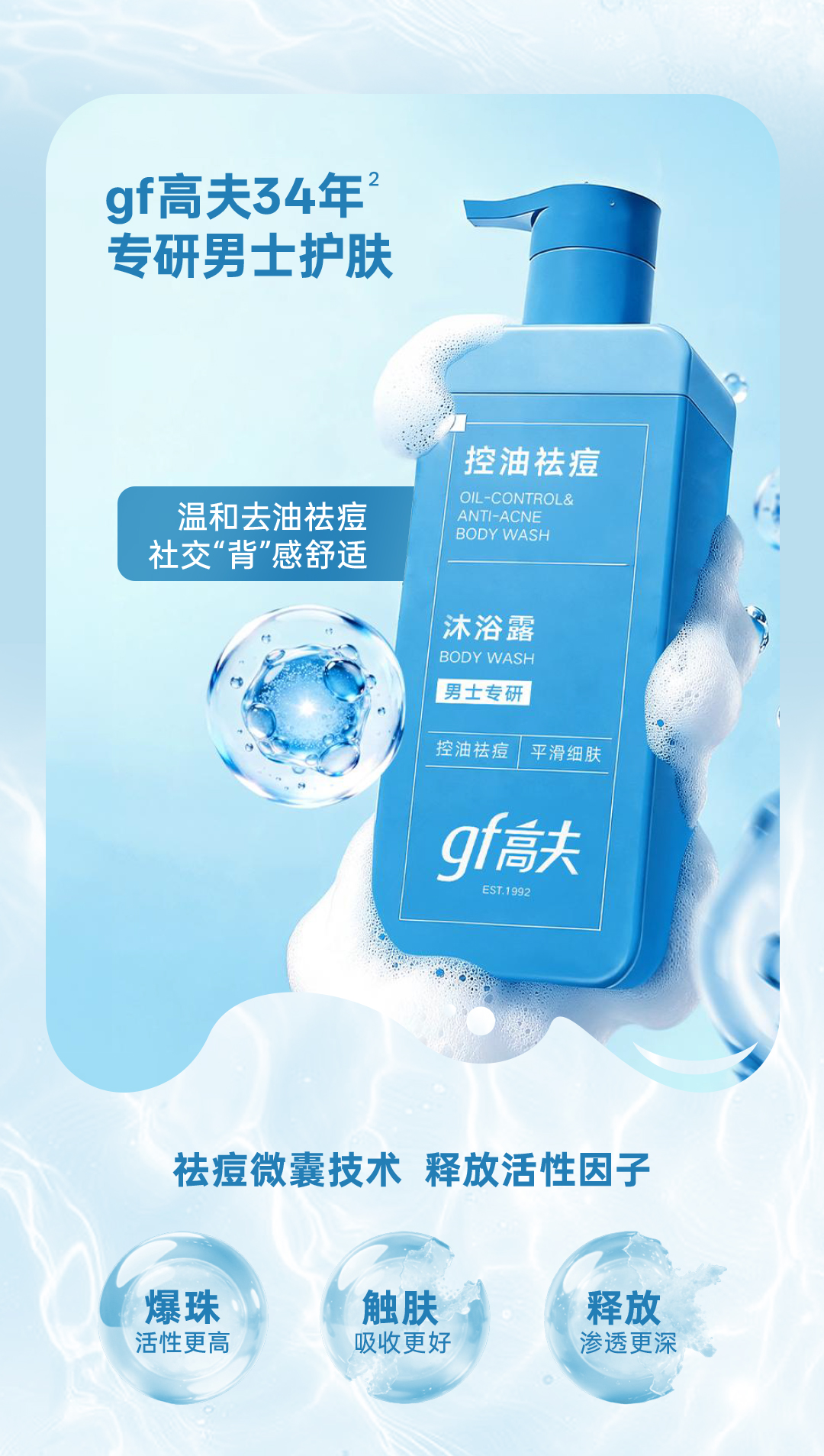 - gf高夫控油祛痘沐浴露:专利去油,净彻背痘。