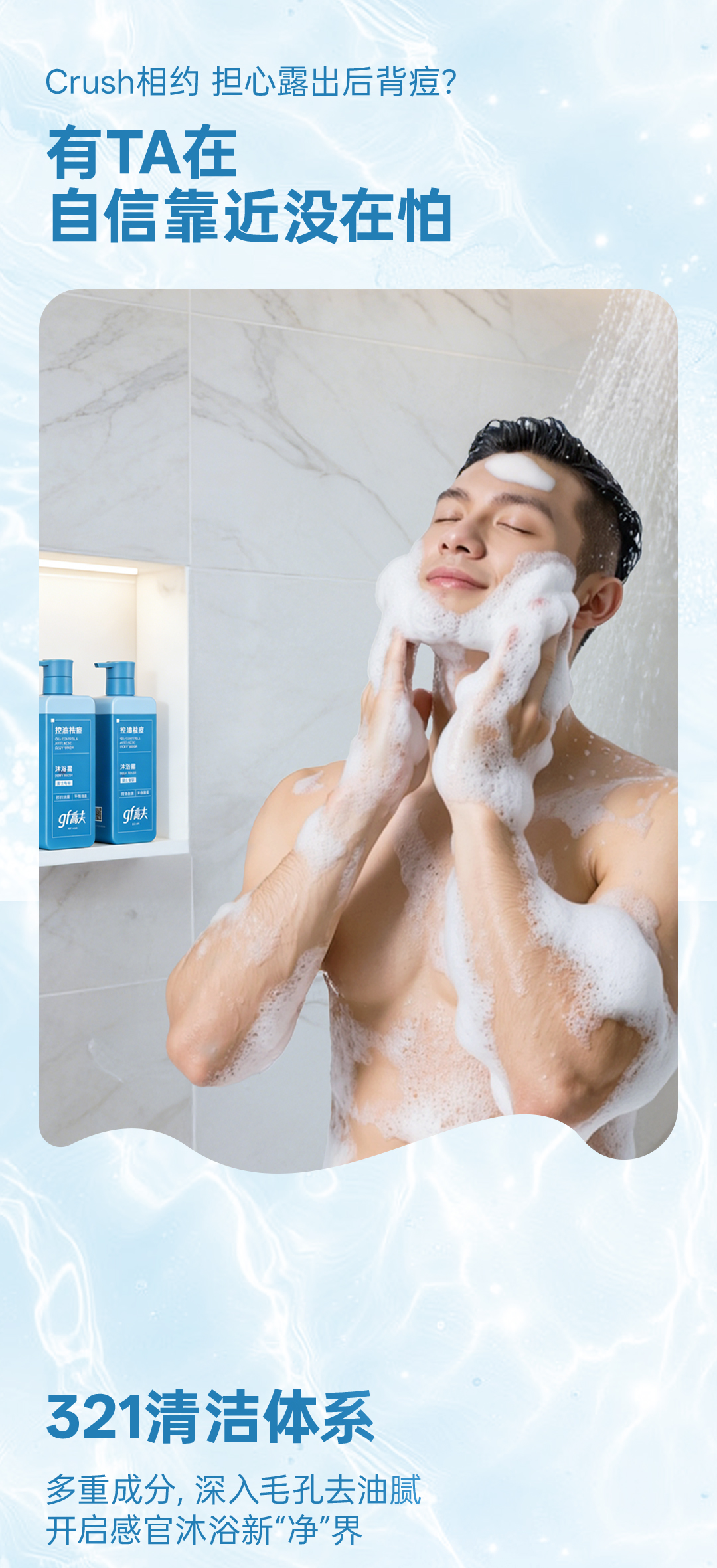 321清洁体系:多重成分,深入毛孔去油腻,开启感官沐浴新“净”界。