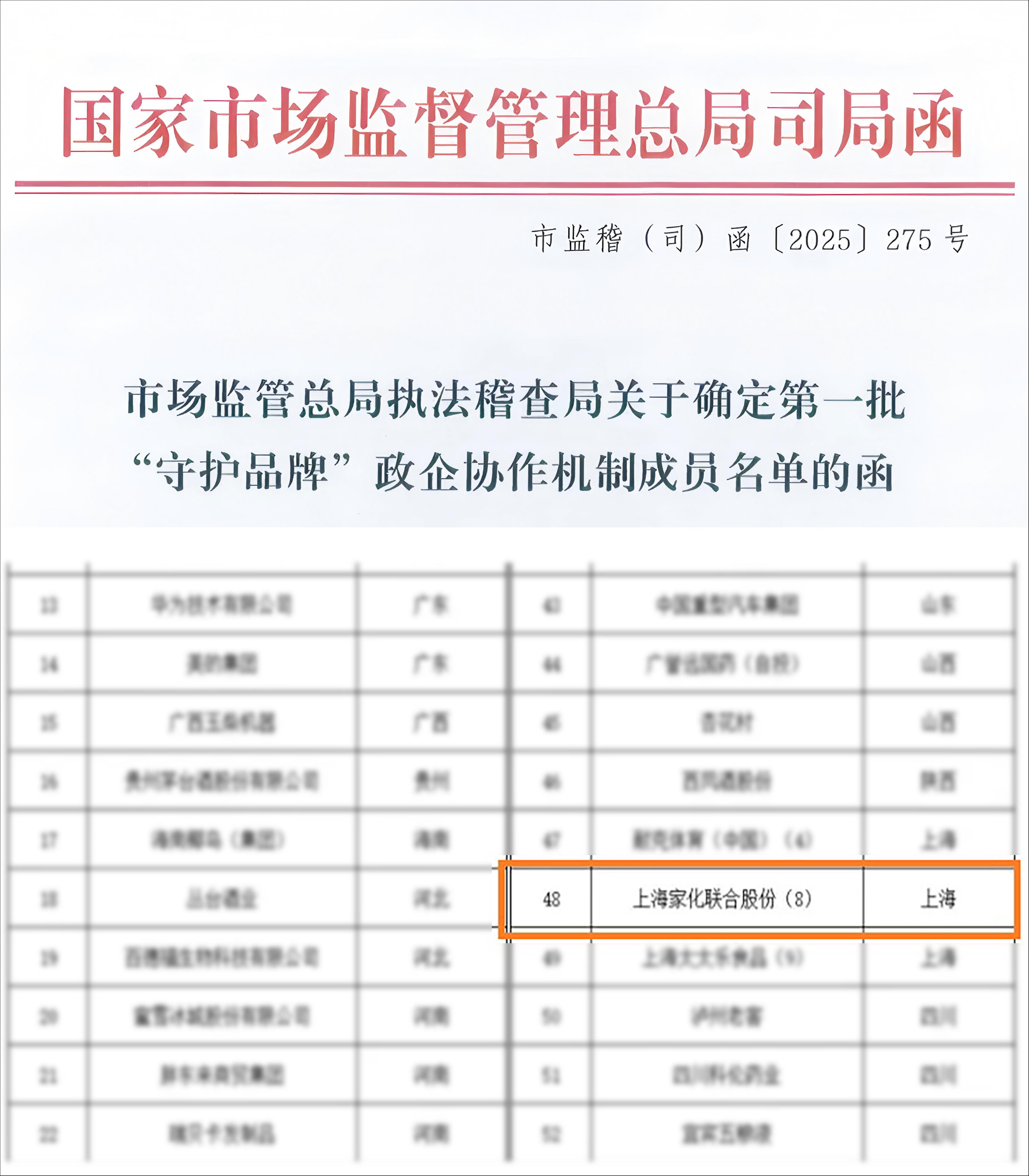 上海家化入选国家市场监督管理总局首批“守护品牌”政企协作机制成员名单