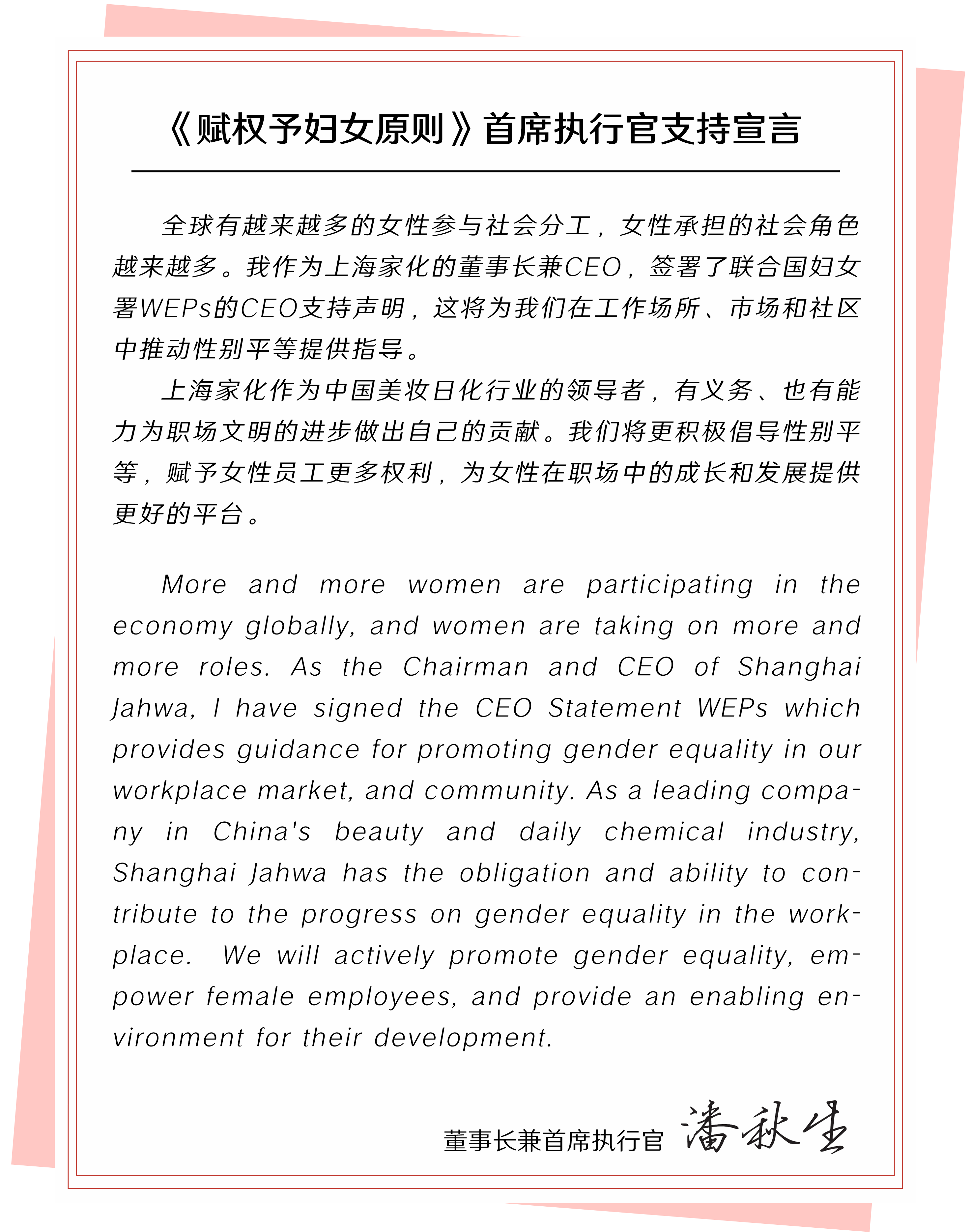 上海家化正式成为联合国妇女署《赋权予妇女原则》(WEPs)全球签署企业成员