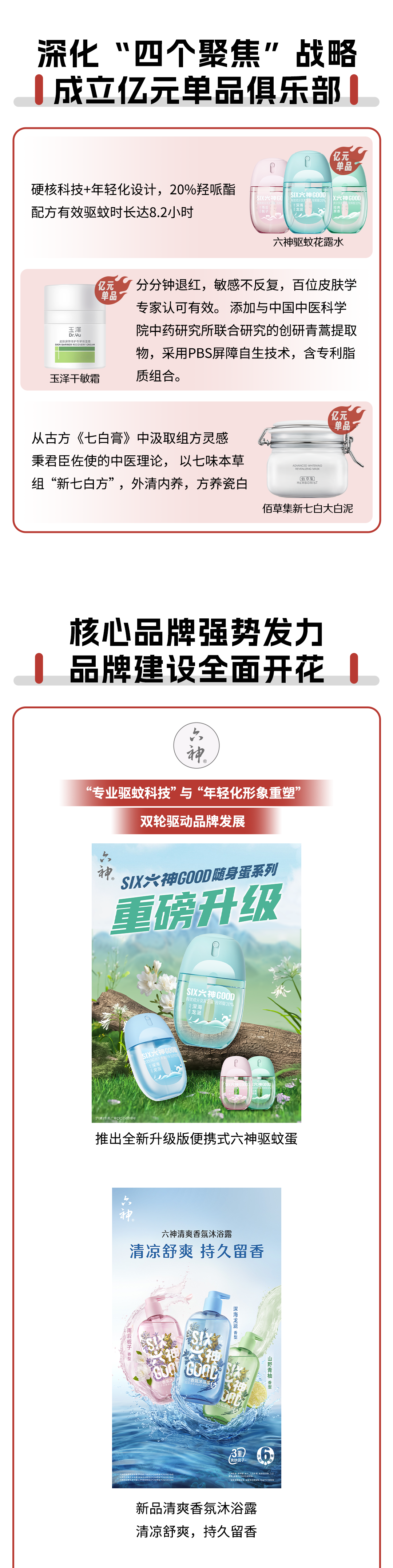 - 六神:以“专业驱蚊科技”与“年轻化形象重塑”双轮驱动品牌发展。推出全新升级版便携式六神驱蚊蛋;新品清爽香氛沐浴露(清凉舒爽,持久留香)。