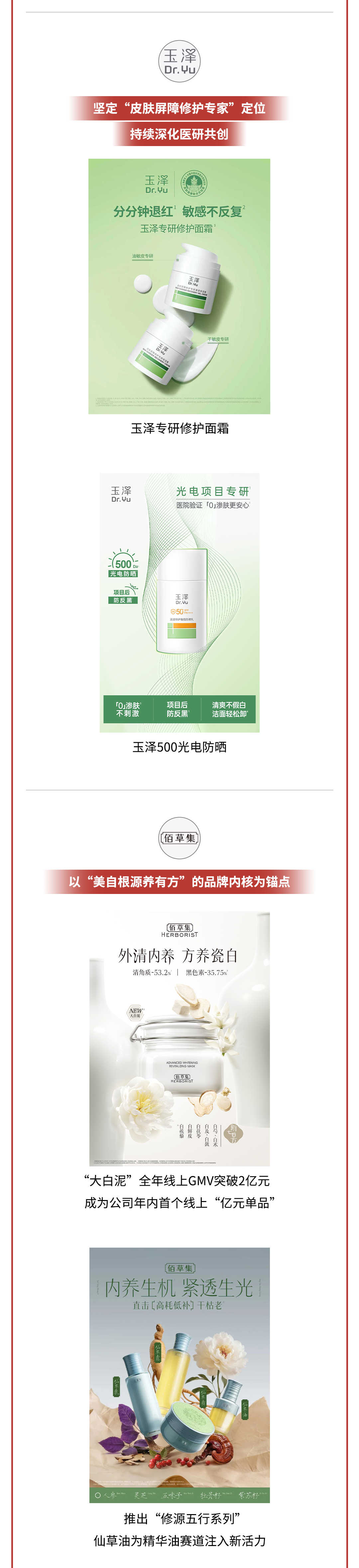 - 玉泽 (Dr.Yu):坚定“皮肤屏障修护专家”定位,持续深化医研共创。代表产品:玉泽专研修护面霜、玉泽500光电防晒。