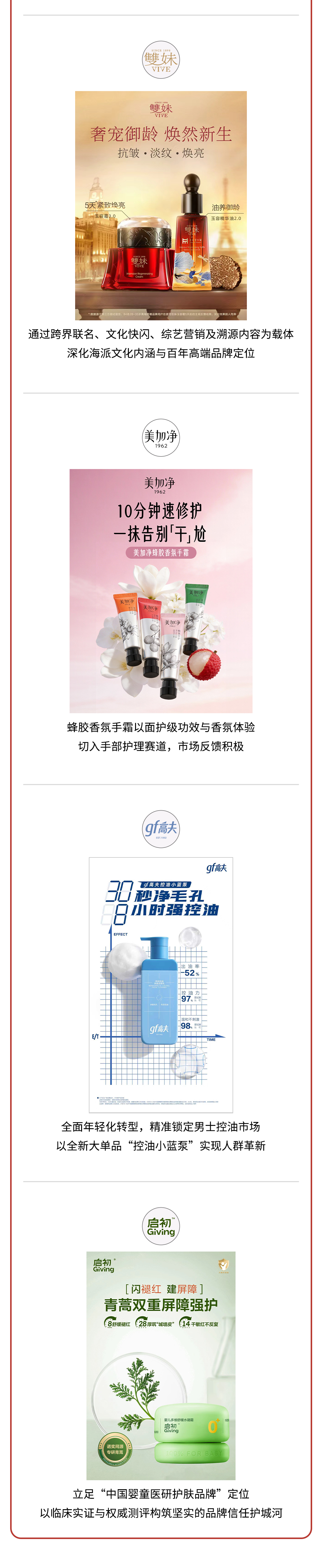 - 雙妹 (VIVE):通过跨界联名、文化快闪、综艺营销及溯源内容为载体,深化海派文化内涵与百年高端品牌定位(代表产品:奢宠御龄 焕然新生系列)。