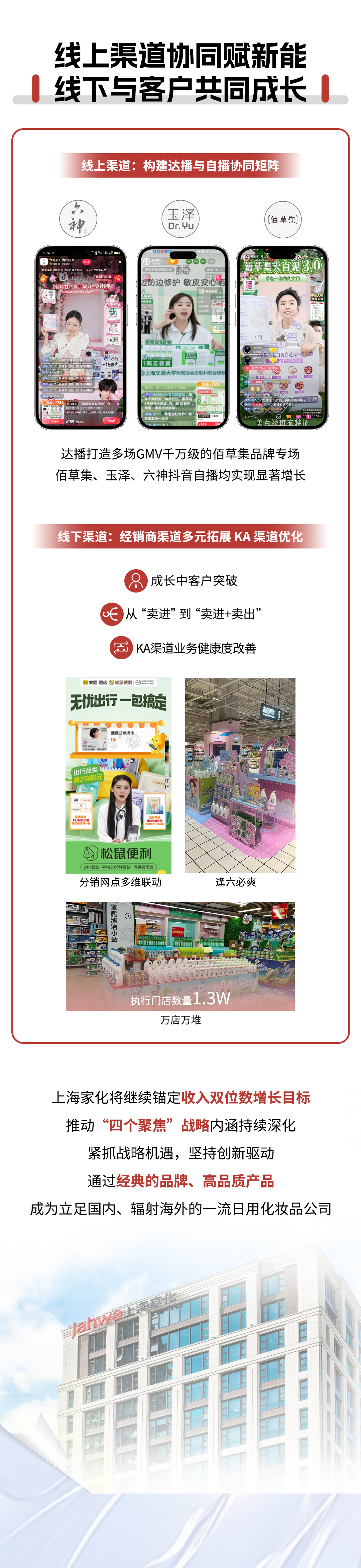 - 线上渠道(构建达播与自播协同矩阵):达播打造多场GMV千万级的佰草集品牌专场;佰草集、玉泽、六神抖音自播均实现显著增长。