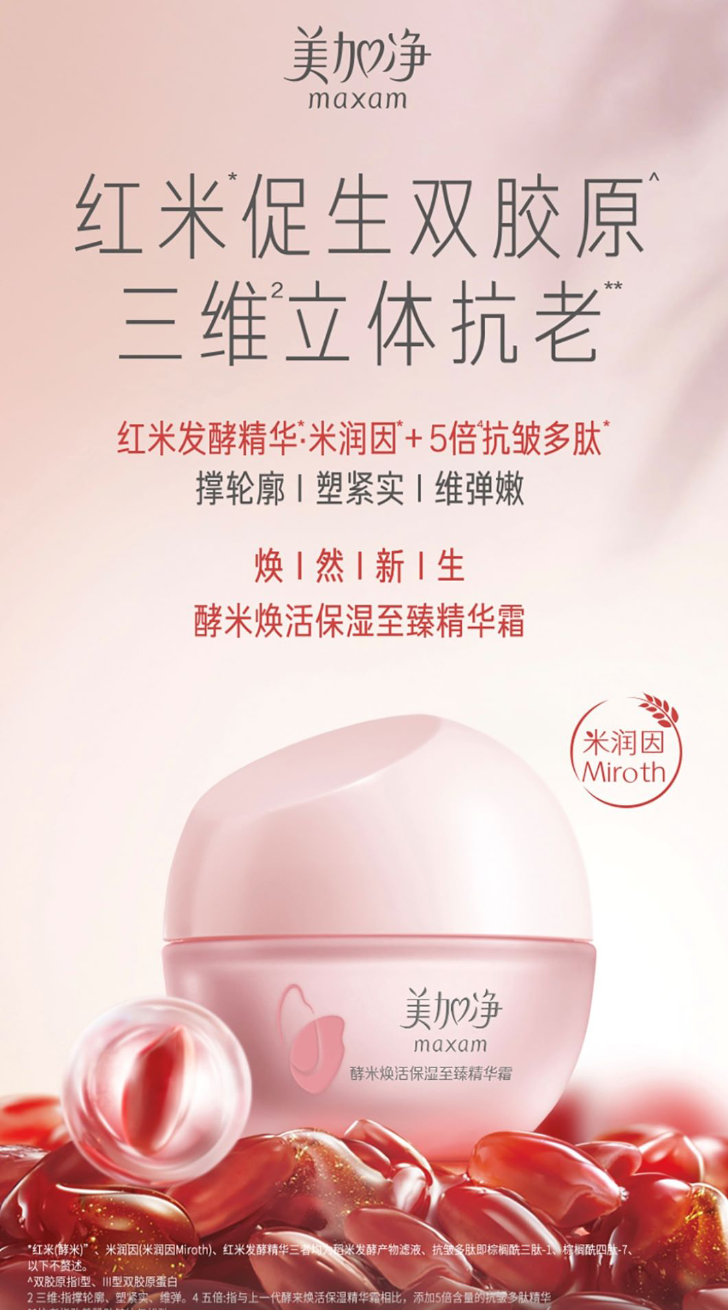 - 添加红米发酵精华·米润因,蕴含280多种**小分子成分,特别添加抗皱多肽精华+ A醇Pro,搭配Pro-VE“微凝珠锁鲜技术”,数百颗Pro-VE微凝珠菁萃