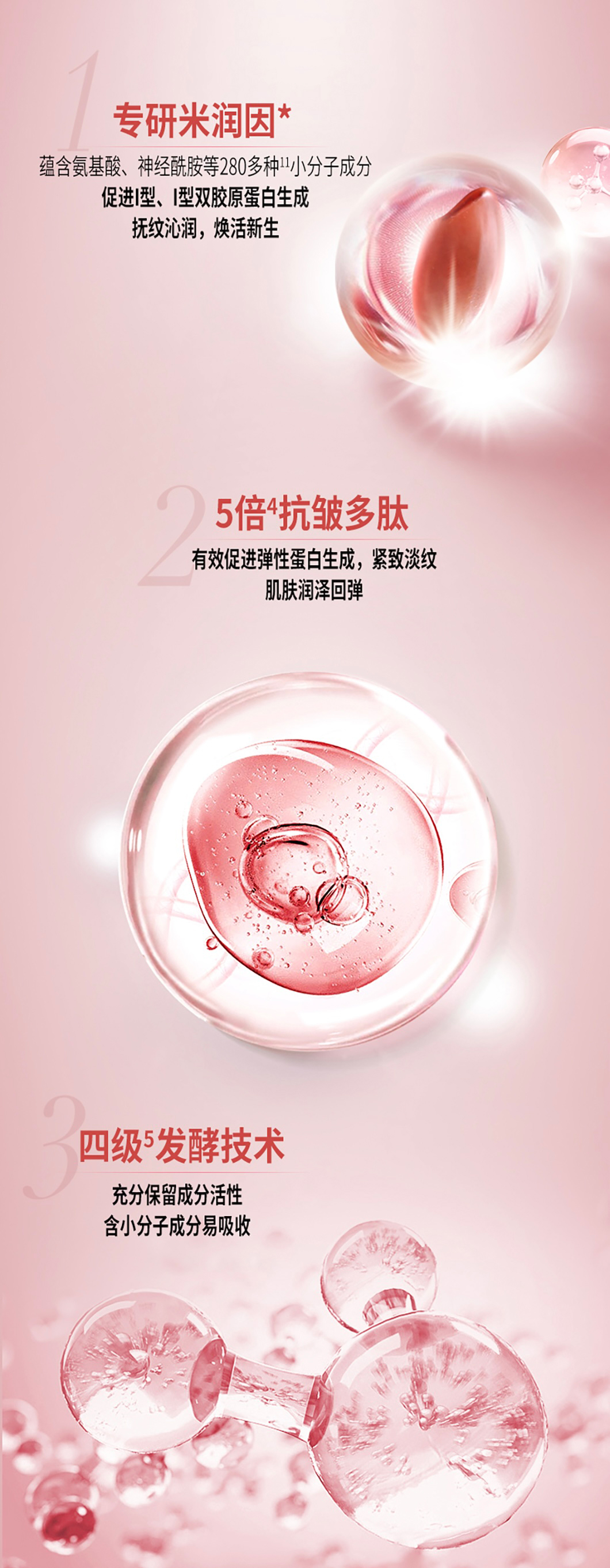 - -专研米润因,蕴含氨基酸、神经酰胺等280多种小分子成分,促进I型、III型双胶原蛋白生成,抚纹沁润、焕活新生。