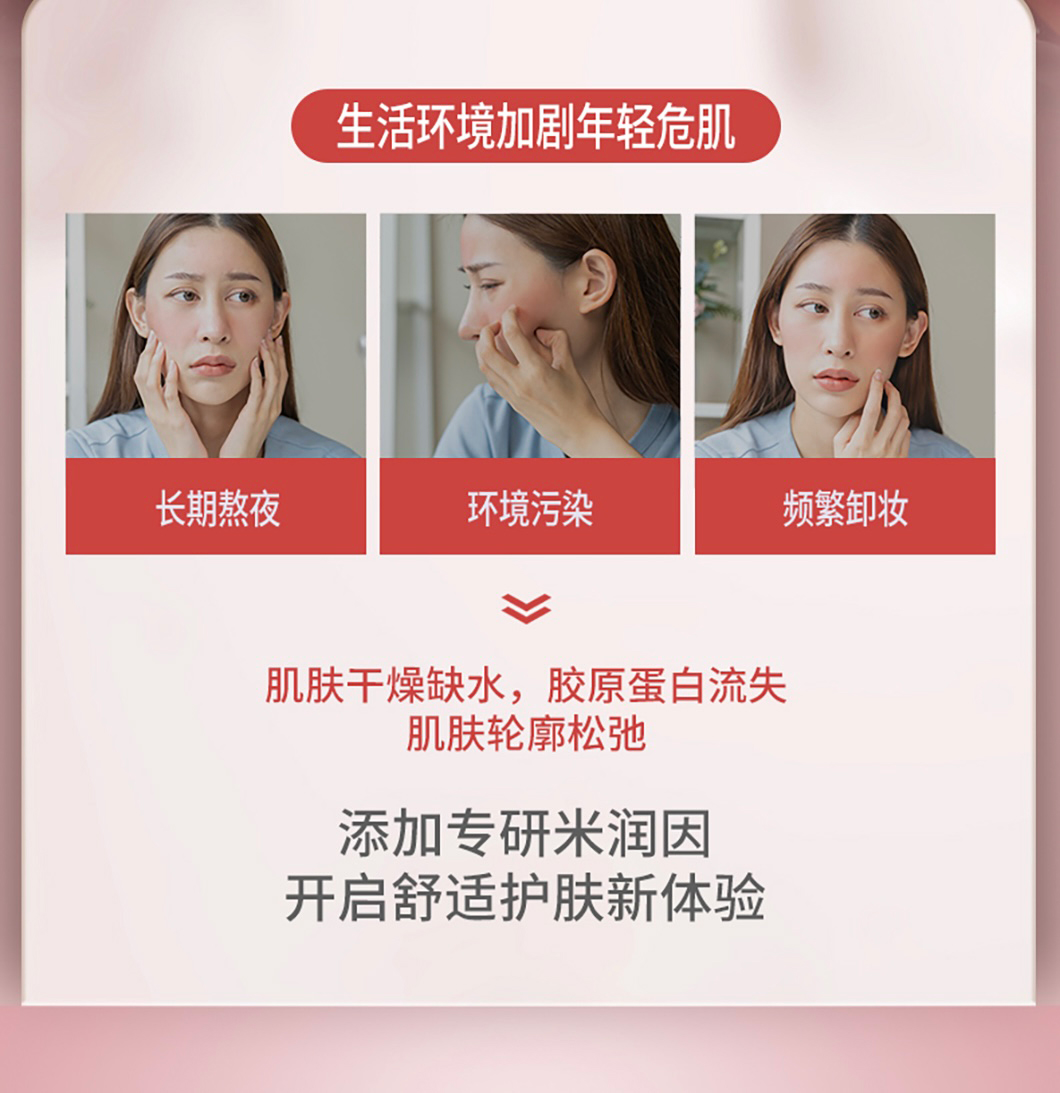 ●使用场景:多场景适配日常护肤需求,针对生活环境加剧的年轻危肌,长期熬夜、环境污染、频繁卸妆导致肌肤干燥缺水,胶原蛋白流失,肌肤轮廓松弛,酵米焕活保湿系列添加专研米润因,5大维度功效,开启抗老焕活新体验。