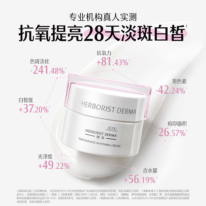 A:有。经上海家化研发中心DPPH抗氧实验测试,烟酰胺美白系列复配成分(烟酰胺、掌叶树提取物、甘草酸二钾、抗坏血酸葡糖苷)对自由基的清除率:水+70.46%、精华+60.11%、乳液+75.43%、霜+81.43%,有效改善暗沉、去黄提亮。