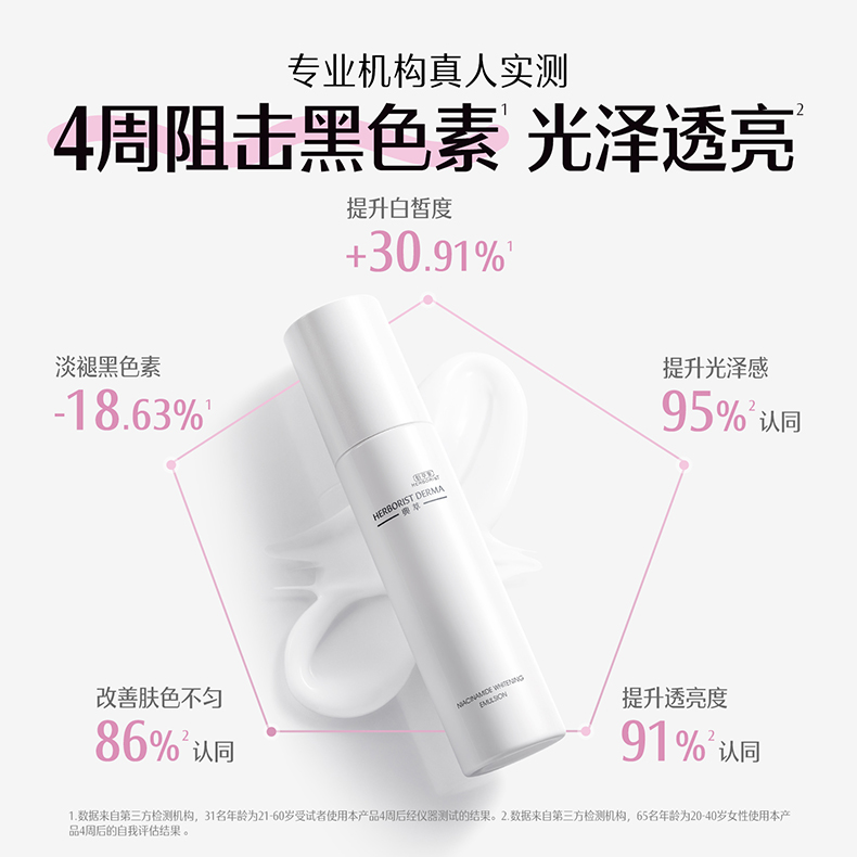 A:典萃烟酰胺美白精华经过SGS检测,61名25-35岁受试者使用28天后停用7天,87%认同肌肤依旧白皙,85%认同依旧有光泽感。产品复配抗氧成分,有效改善暗沉,减少返黑返黄。