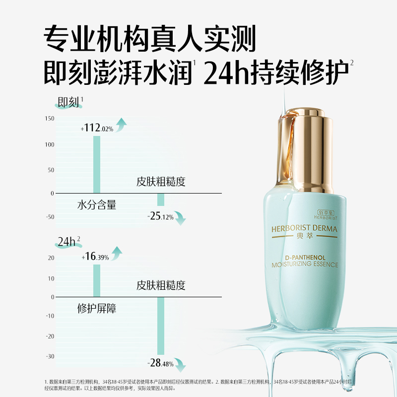 A:典萃B5精华液备案功效为修护、保湿、舒缓。第三方检测显示:即刻水分含量+112.02%,皮肤粗糙度-25.12%;24小时修护屏障+16.39%,皮肤粗糙度-28.48%。添加维生素原B5、依克多因、积雪草精粹,复配金钗石斛与麦冬4:3配比,有上海家化科研中心论文支持。
